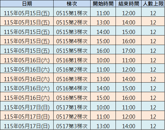 預約時間:115年 4 月 11 日(六)上午10時至 5 月 6 日(三)下午 2 時止。